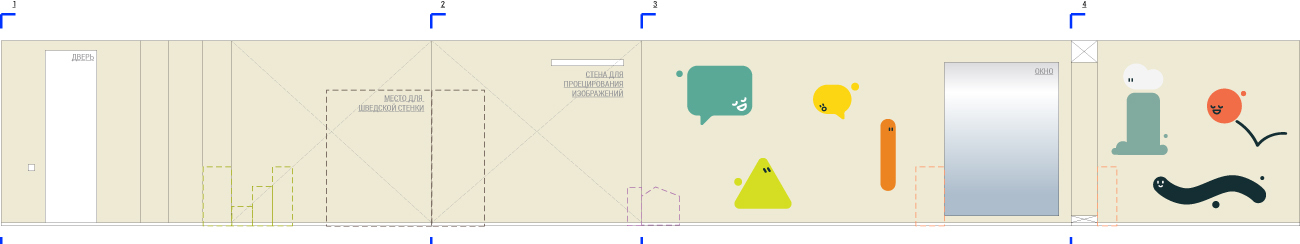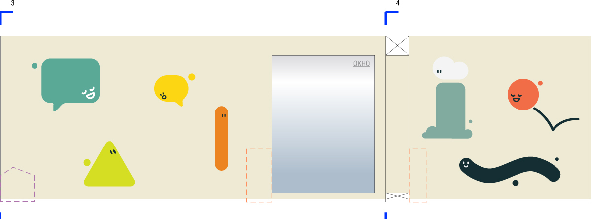 Мы выполнили полный обмер помещения, начертили развёртки стен и изотермический вид для демонстрации помещения в объёме. Клиент предоставил векторные макеты персонажей, что позволило ускорить согласование проекта. Нашей задачей было создание нескольких вариантов композиции и поиск способов изготовления фигур. Помимо трафаретного переноса рисунков нами были предложены ещё два варианта оформления стены: объёмный и комбинированный. Фигуры можно было вырезать на лазерном станке из фанеры, покрасить, приклеить глазки, улыбочки и повесить на стены. А в комбинированном варианте верхние персонажи рисовались бы по трафарету, а нижние вырезались из специальной виниловой плёнки с маркерным и меловым покрытием, чтобы дети рисовали непосредственно по фигурам.
